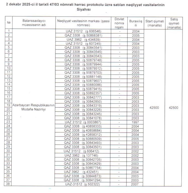| 3 | Azərbaycan Respublikasının Müdafiə Nazirliyi | 38 ədəd müxtəlif markalı nəqliyyat vasitəsi | Siyahı əlavə olunur | 42500 | 42500 | 42/25 15.10.2025 |